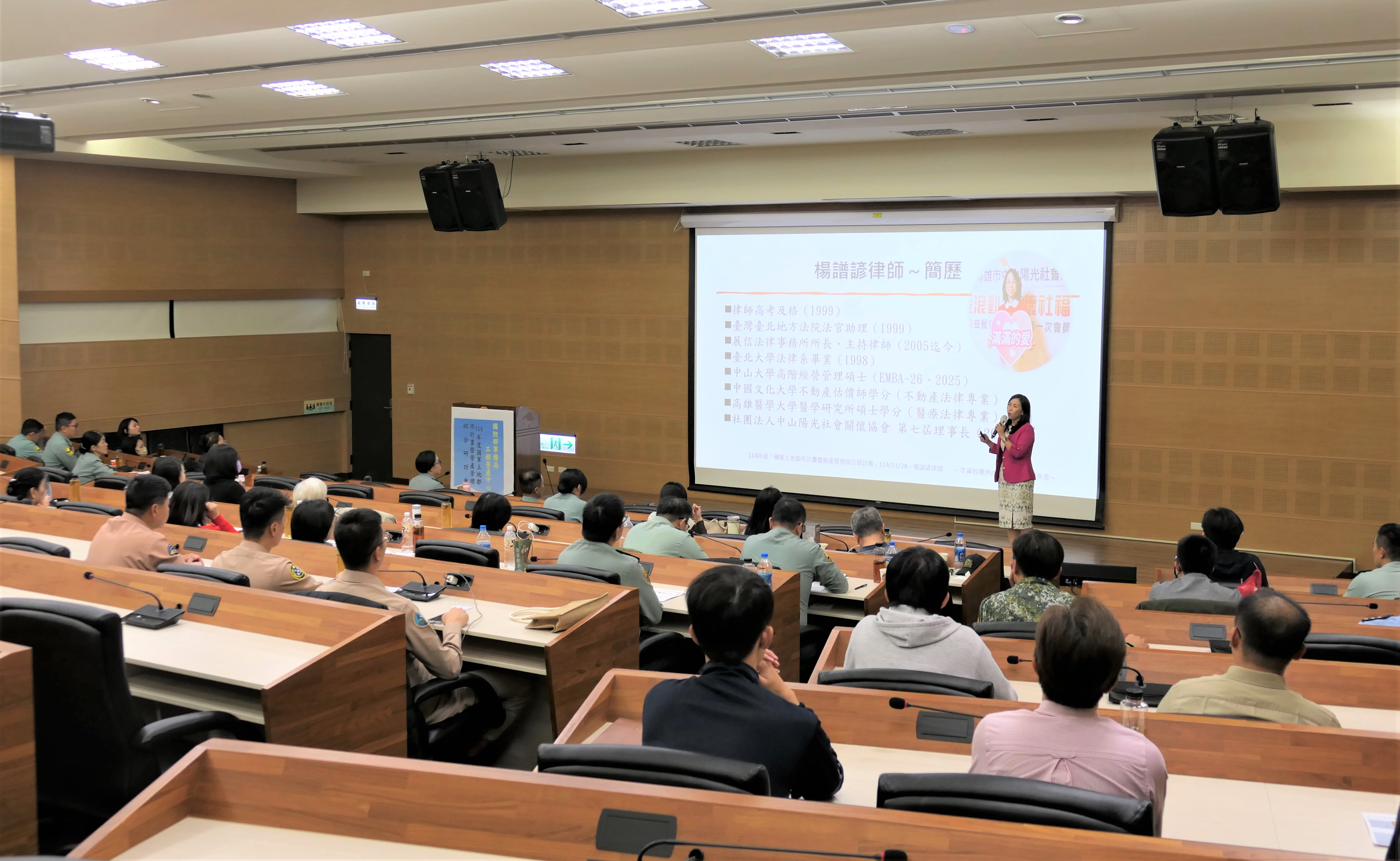 研討會邀請各軍種業務主管與承辦人員共同出席,並由國產署南區分署黃清和股長以「從國防轉型到地方創生:軍事用地再利用地方策略分析」及展信律師事務所楊譜諺律師以「營區周邊土地遭占之實務處理」等主題進行專題講演,增進與會人員職能。