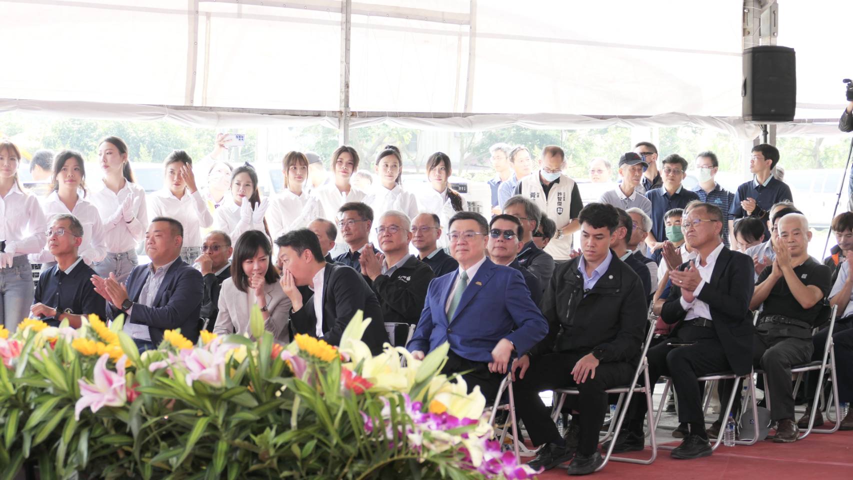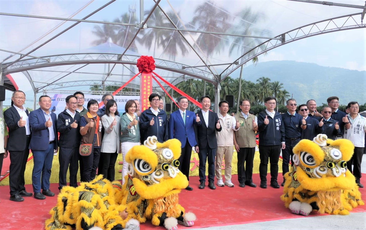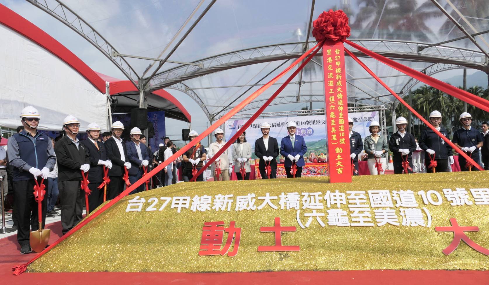 今日動土典禮在祥獅獻瑞鑼鼓聲中熱鬧開場,卓院長蒞臨會場後,首先欣賞「麒麟原住民文化藝術團」帶來的慶賀表演,接續聽取交通部公路局陳文瑞局長簡報,瞭解工程設計理念、特色、規劃及經費等。隨後,卓院長與行政院李慧芝發言人、交通部陳世凱部長、路政及道安司黄運貴司長、公路局陳文瑞局長、行政院南部聯合服務中心許乃文執行長、陳文亮副執行長、伍麗華立委、李昆澤立委、邱議瑩立委、許智傑立委、賴瑞隆立委、高雄市陳其邁市長、屏東縣政府楊慶哲秘書長、台灣世曦工程顧問股份有限公司施義芳董事長、新亞建設開發股份有限公司代表等人起鍬三鏟,完成動土儀式,並與現場貴賓們合影留念。