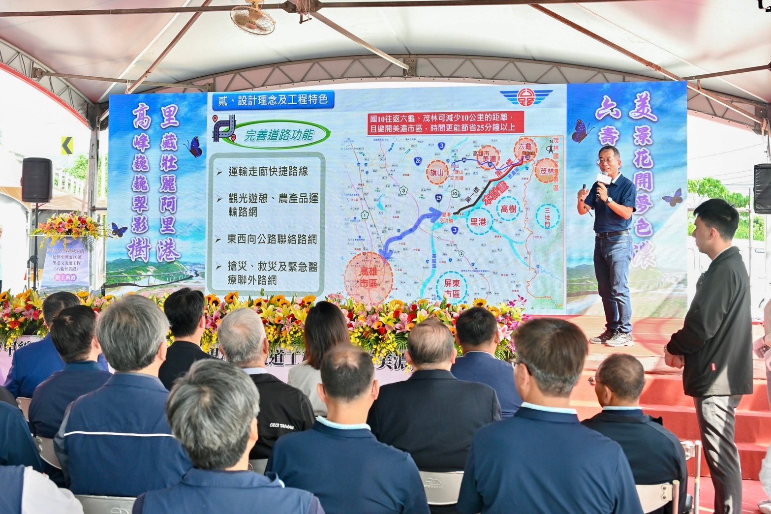 卓院長表示,今日動土典禮受到近月來數個颱風的影響而延期兩次,但「動工可以延期,完工不能延期」,尤其本工程行經荖濃溪路線的高架橋梁段全長共6.2公里,對於施工有相當大的考驗,請工程團隊務必以安全為最優先考量,積極展現工作效率,在核定的工期內如期如質完工。他強調,本工程是高屏山區與國道交通網之間的重要連接工程,未來完工後,不僅有助打造健全、便利的高屏生活圈、協助農產品運輸,更是一條救人命的道路,可及時發揮搶救災、緊急醫療救護及運送功能。