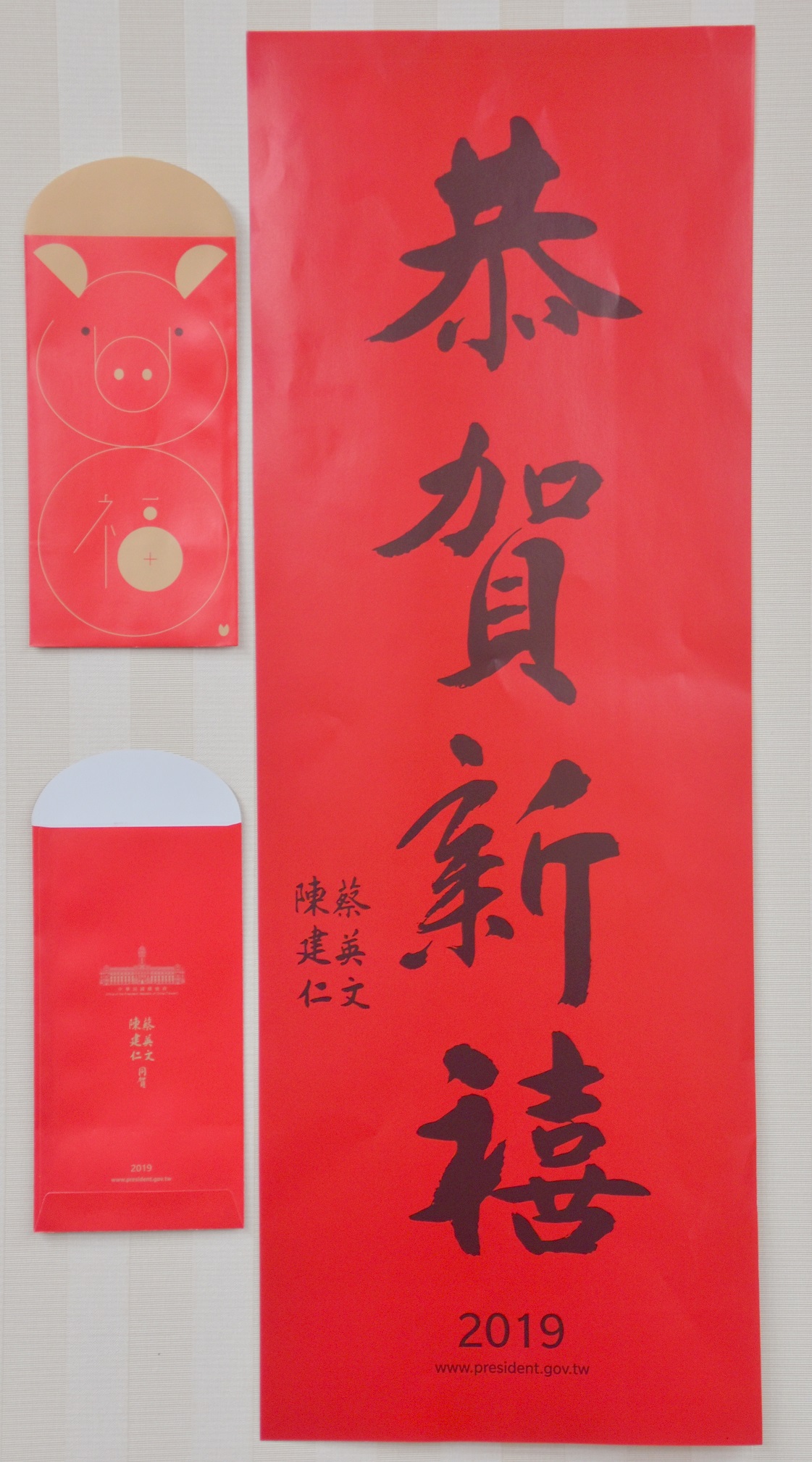 為迎接2019「豬」年到來,並傳達蔡總統與陳副總統的新春祝福、祈願國泰民安以及「豬」事吉祥,行政院南部聯合服務中心自即日起上班時間,在南部中心與合署辦公單位贈發蔡總統「恭賀新禧」春聯及紅包袋,歡迎鄉親索取,贈完為止。