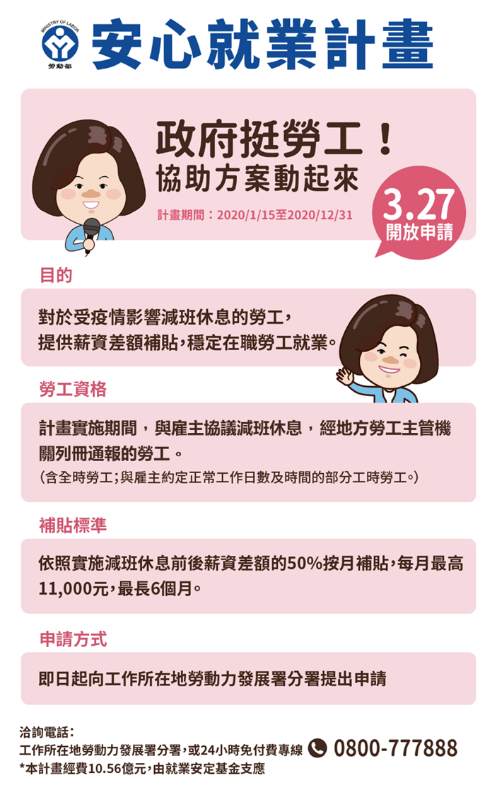 行政院日前祭出1兆500億紓困方案,勞動部已分別針對減班休息勞工、失業勞工、企業等,盤點擴大既有的行政措施,並新增多項協助措施,昨(7)日宣布4項最新紓困方案,包含「安穩青年就業計畫」、「自營作業者補助」、「勞工紓困貸款」、「公共服務短期上工計畫」等。