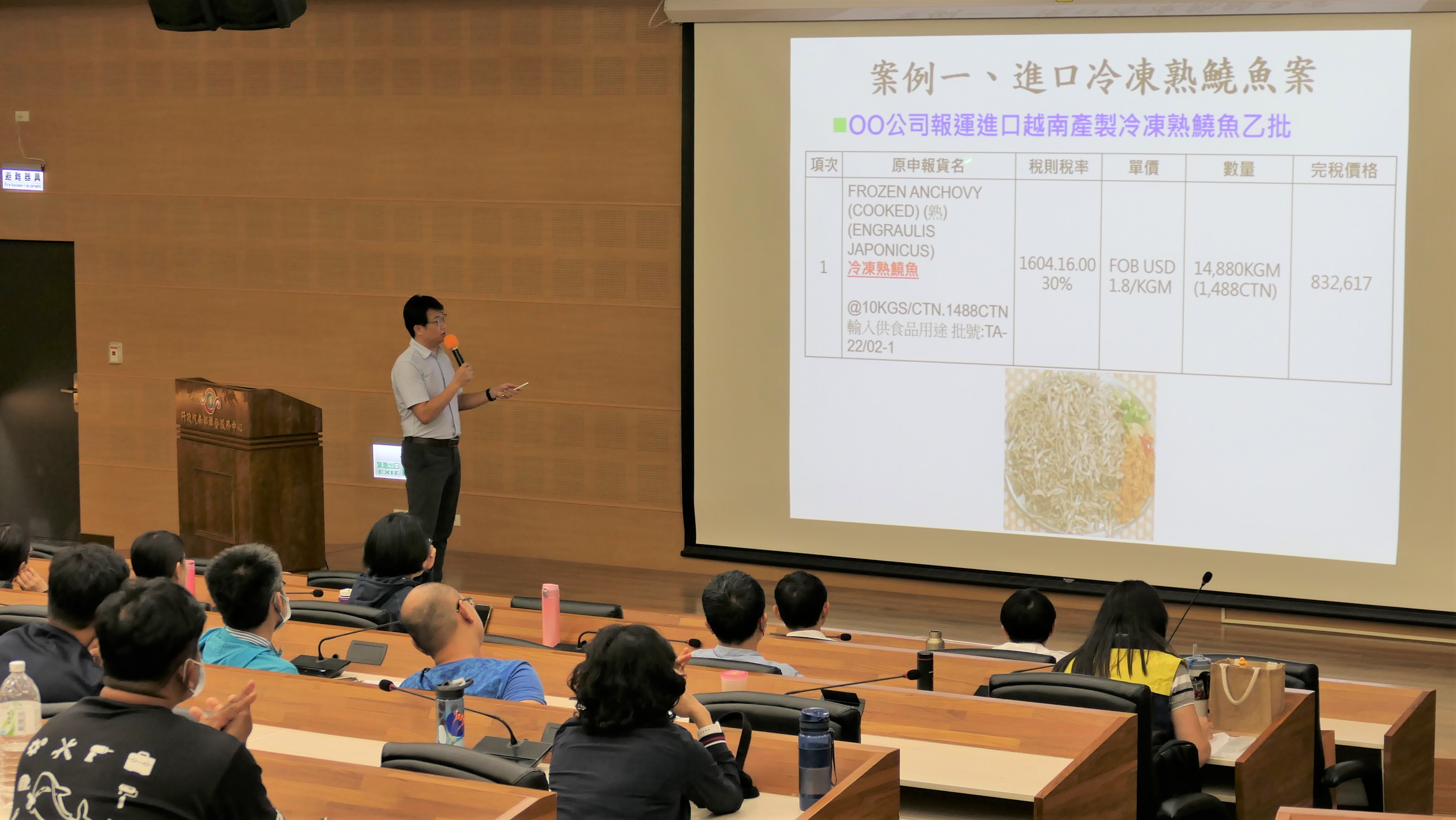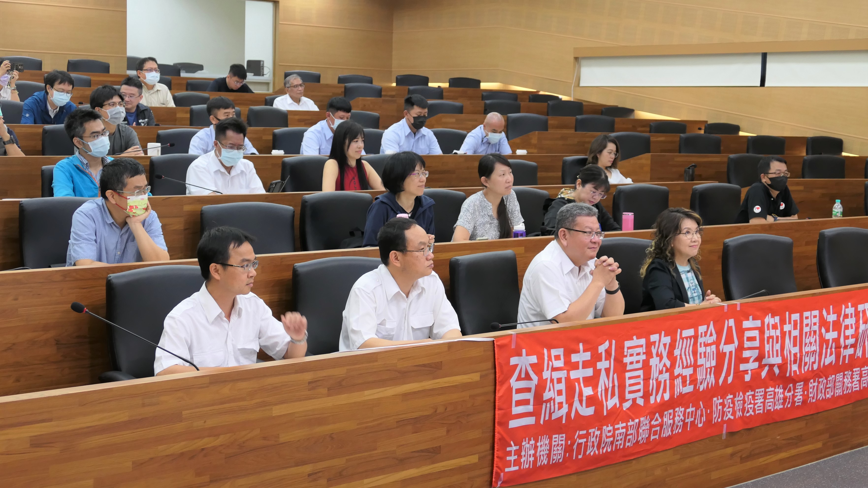 今日課程邀請海巡署偵防分署雲林查緝隊王瑞明組主任以查緝走私案例分享歷年偵辦像是走私活體禽鳥、大陸北蒜等案件;關務署高雄關小港分關邱學禮課長則說明貨物通關流程,以及分享進口冷凍熟鱙魚、進口偽農藥、快遞進口動物禁藥等實際案例之處理;最後還有臺灣高雄地檢署曾靖雅檢察官分享由走私案看法律構成要件及調查。
