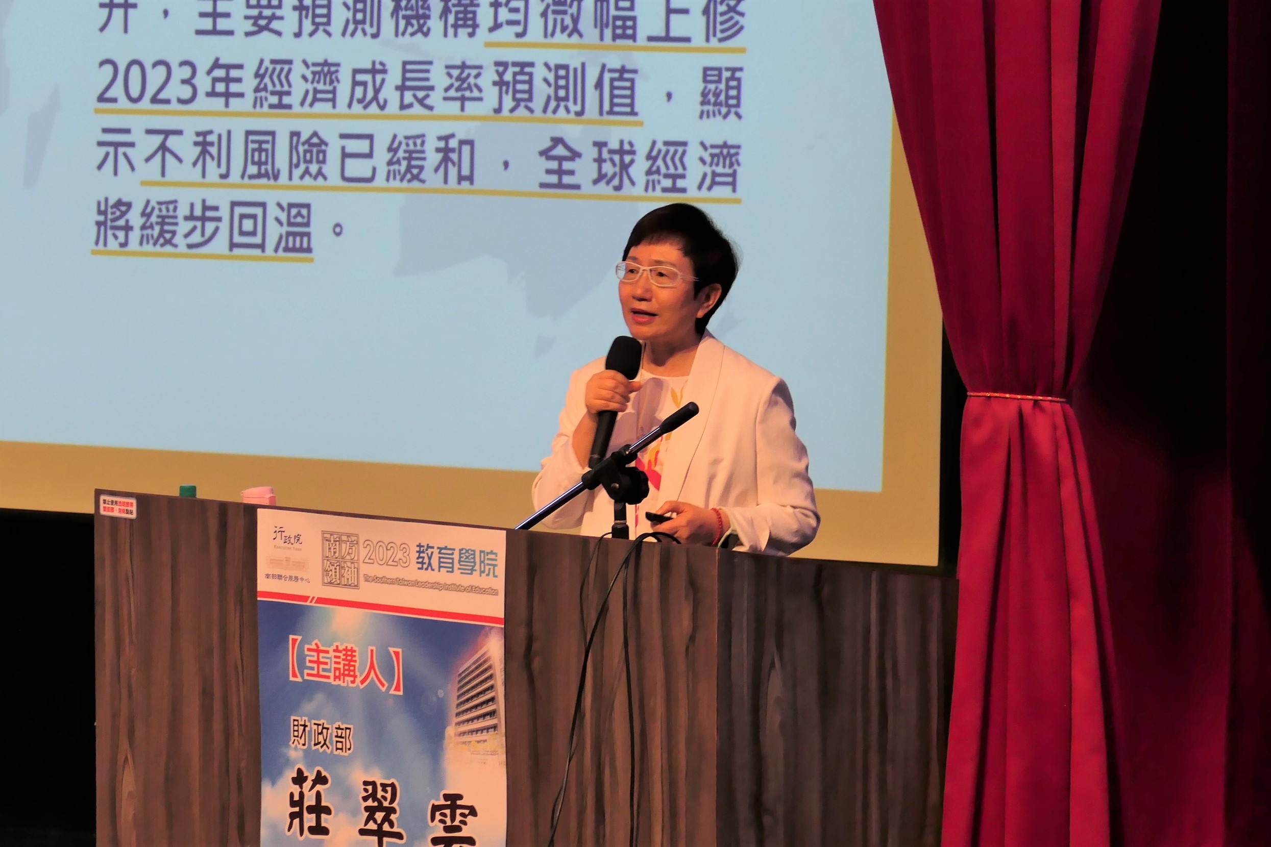 2023「南方領袖教育學院」今(22)日下午邀請到財政部莊翠雲部長蒞臨演講,行政院南部聯合服務中心副執行長陳慧玲致詞時表示,很榮幸能邀請到莊部長談「我國財政現况與政策展望」,現場近200人共同參與。