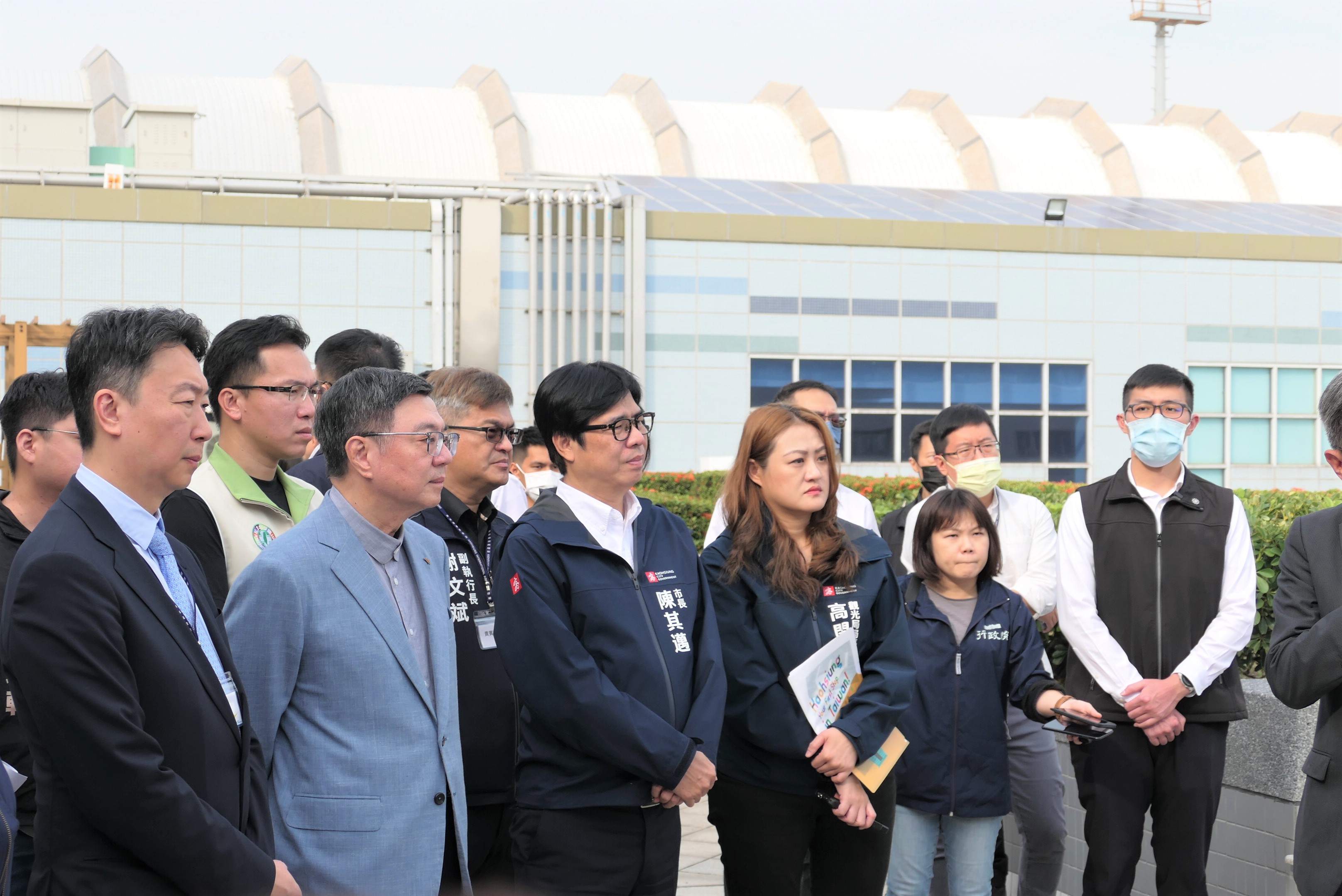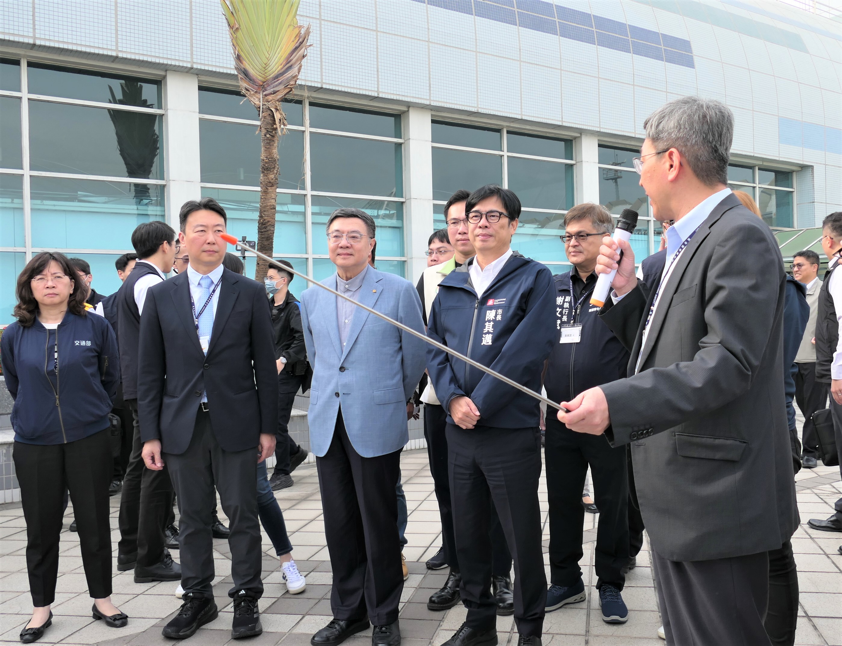 此行,卓院長抵達後,先聽取交通部民用航空局何淑萍局長簡報說明「提升高雄機場航線量能」,並於致詞結束後,與行政院李慧芝發言人、交通部陳世凱部長、高雄市陳其邁市長、行政院南部聯合服務中心謝文斌副執行長等人,進行現地視察,鳥瞰新航廈基地位置,瞭解新航廈整體規劃與期程。