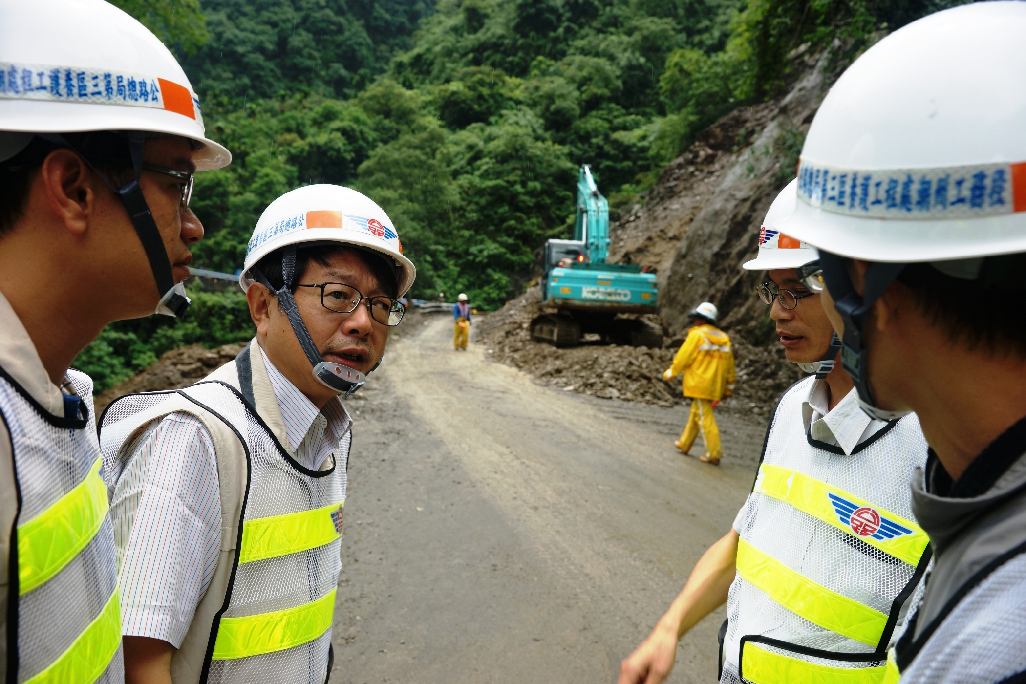 洪建隆在屏東聽取三地門鄉公所秘書韓志寬說明災情,並由交通部公路總局第三區養護工程處副處長徐文義、潮州段長余兆興、屏東監工站站長程永隆、工程司郭蔚楓等陪同勘查通往霧台鄉台24線35.2K道路坍方搶通工程。