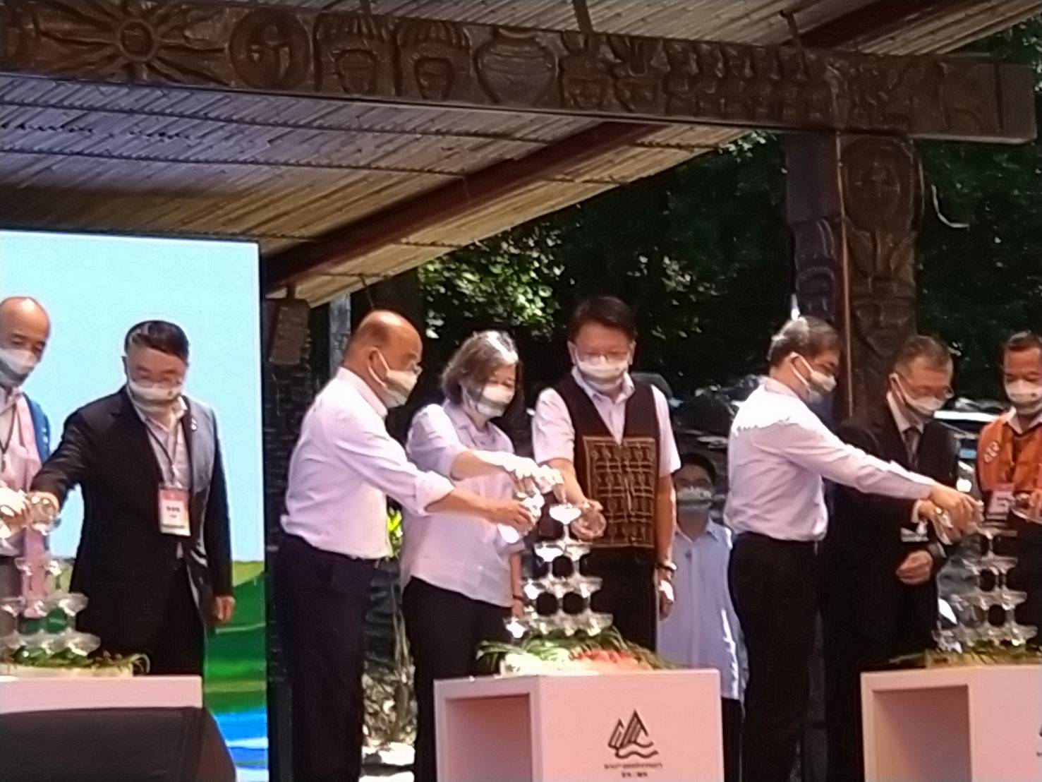 致詞結束後,由總統蔡英文、行政院院長蘇貞昌、縣長潘孟安、日本台灣交流協會高雄事務所小野一彥所長、行政院秘書長李孟諺、鳥居信平嫡孫鳥居徹、來義鄉莊景星鄉長、立委伍麗華、水利專家丁澈士一起在香檳塔倒入二峰圳水製作的氣泡飲,象徵二峰圳百年慶祝系列活動正式啟動。