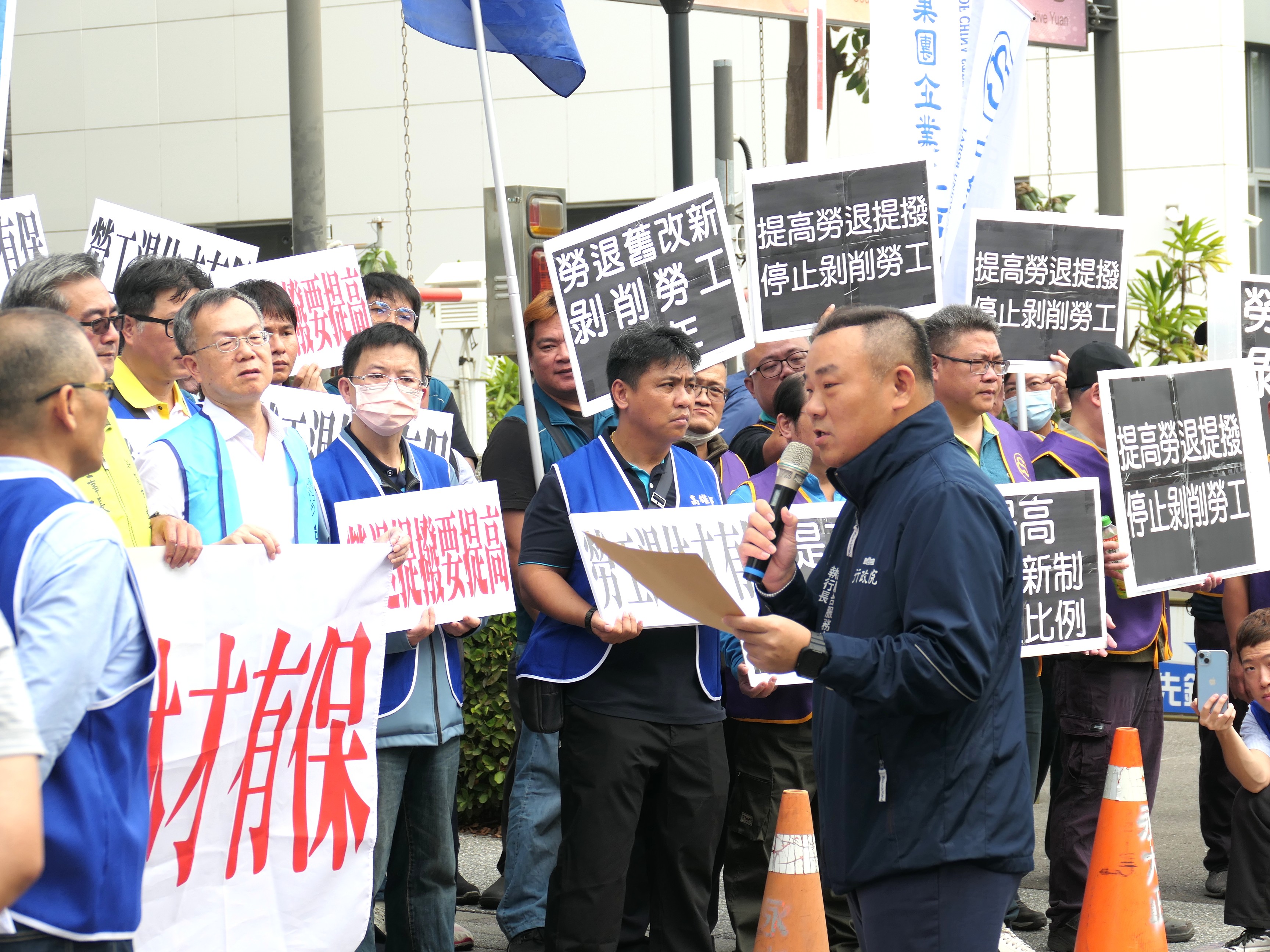 多個勞工團體今天到行政院南部聯合服務中心,訴求提高勞退雇主強制提撥率,以保障勞工退休生活。南服中心許乃文執行長接下陳情書並表示,盼在農曆新年後,向各工會報告相關進度。