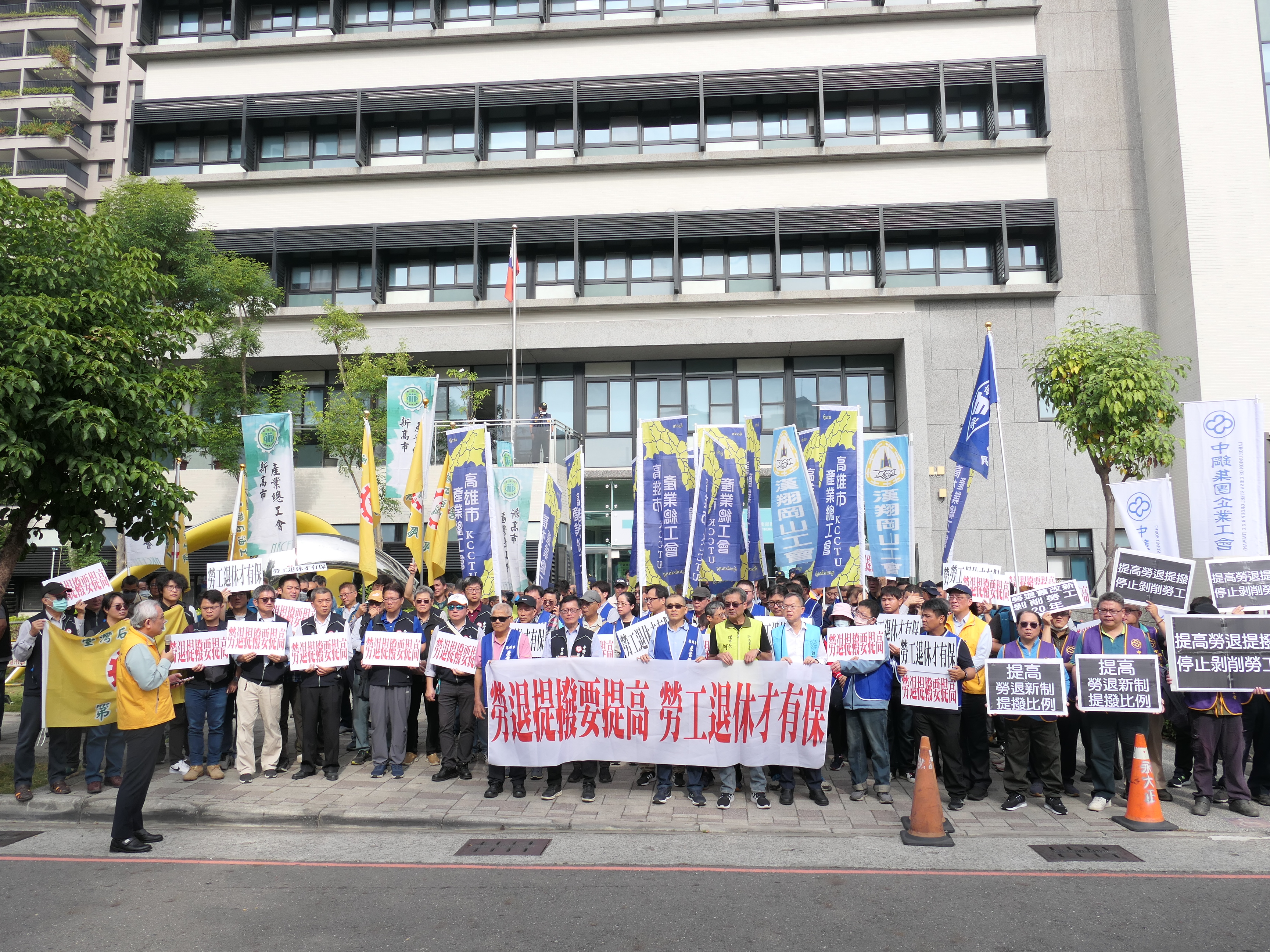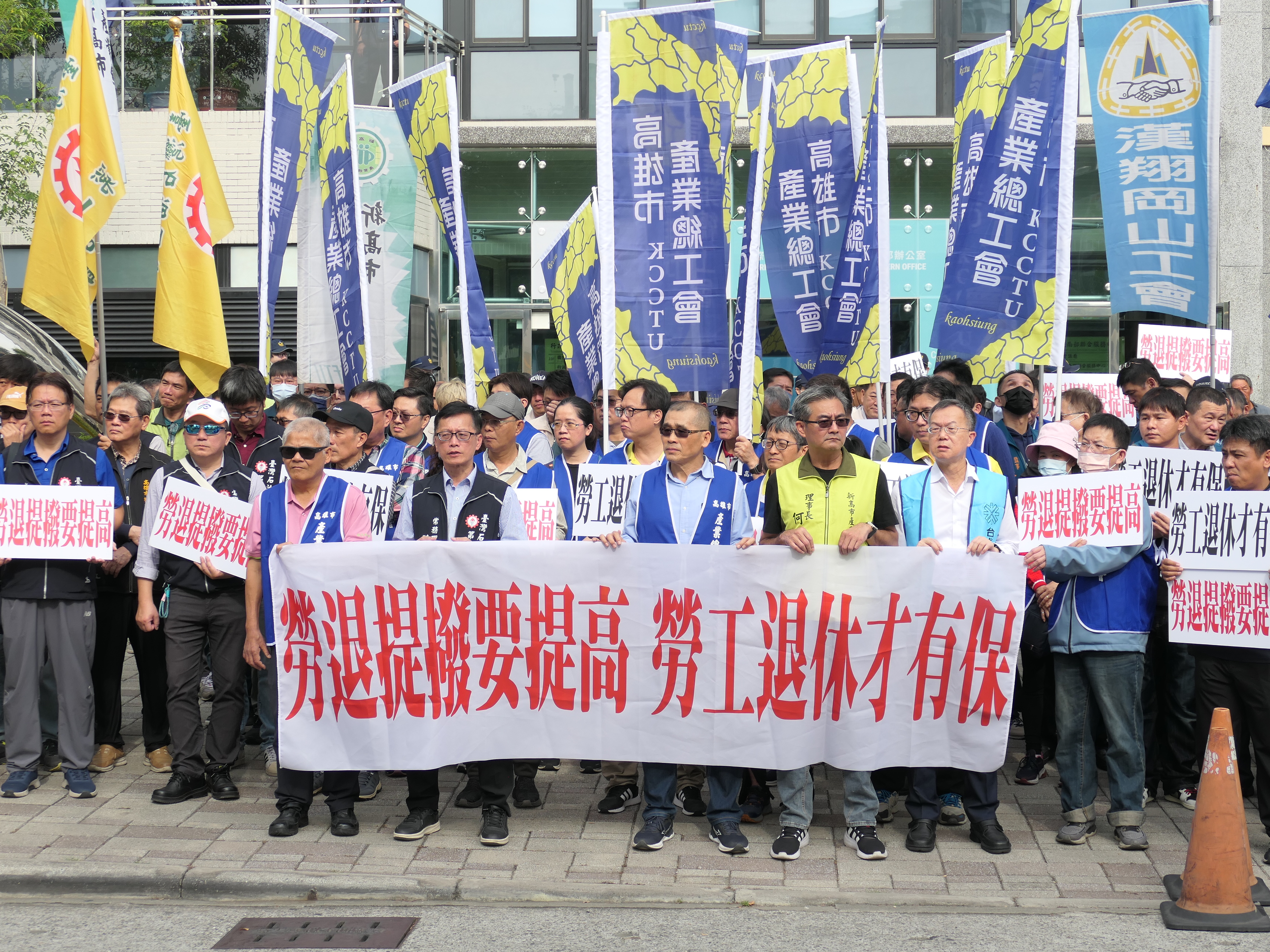 高雄市產業總工會、全國金融業工會聯合總會等團體,今天到南服中心舉辦記者會陳情,各勞團手舉旗幟、高喊「勞退提撥要提高,勞工退休才有保」等口號。