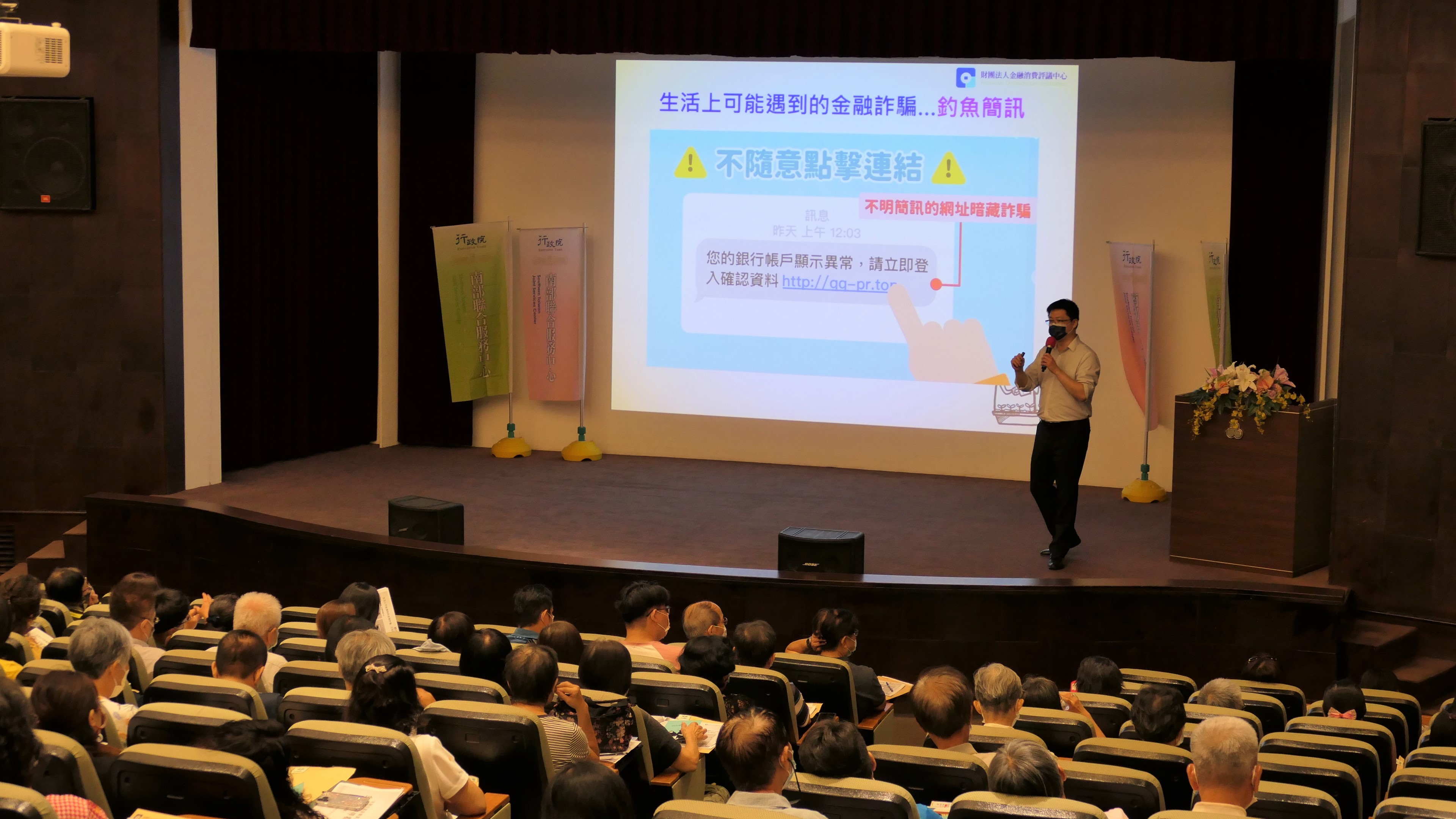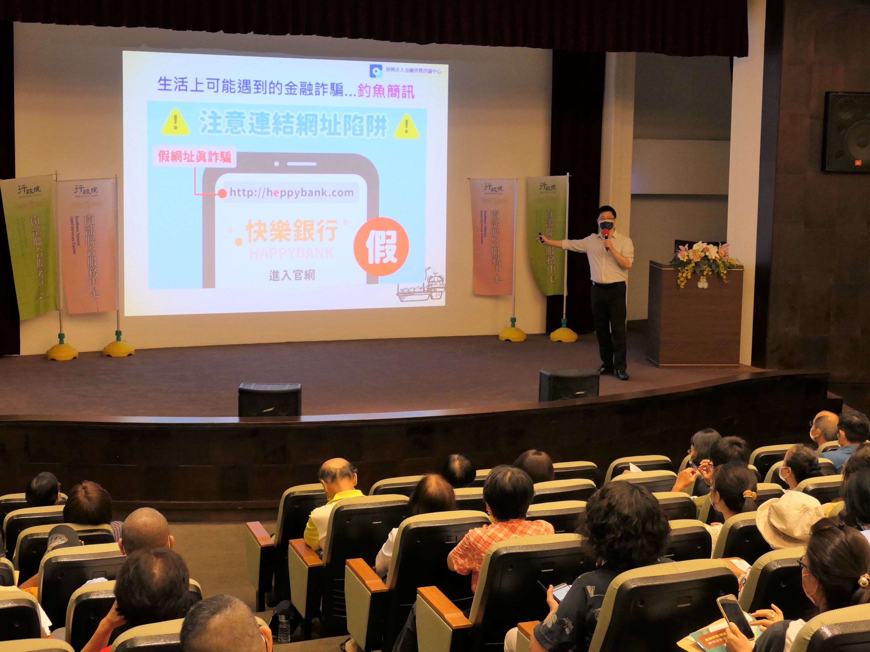 近來金融剝削的案件頻傳,尤其在臉書、LINE或是簡訊常會出現誘騙受害者進行投資的訊息,行政院南部聯合服務中心、金融監督管理委員會(以下簡稱金管會)與金融消費評議中心於今(25)日舉辦「金融知識宣導-銀行篇」講座,由行政院南服中心副執行長許乃文進行開場致詞,邀請到金融消費評議中心許朕翔專員,主講金融消費爭議處理及高齡者如何選擇自身需求之金融商品。