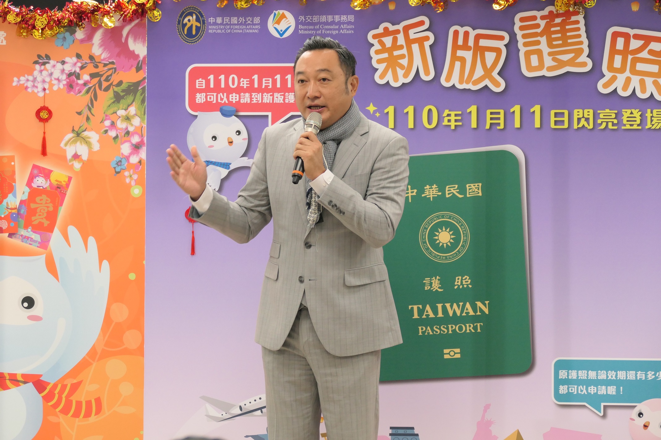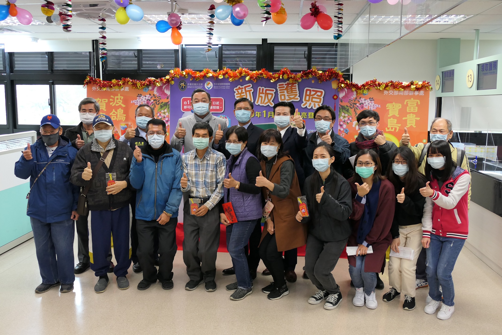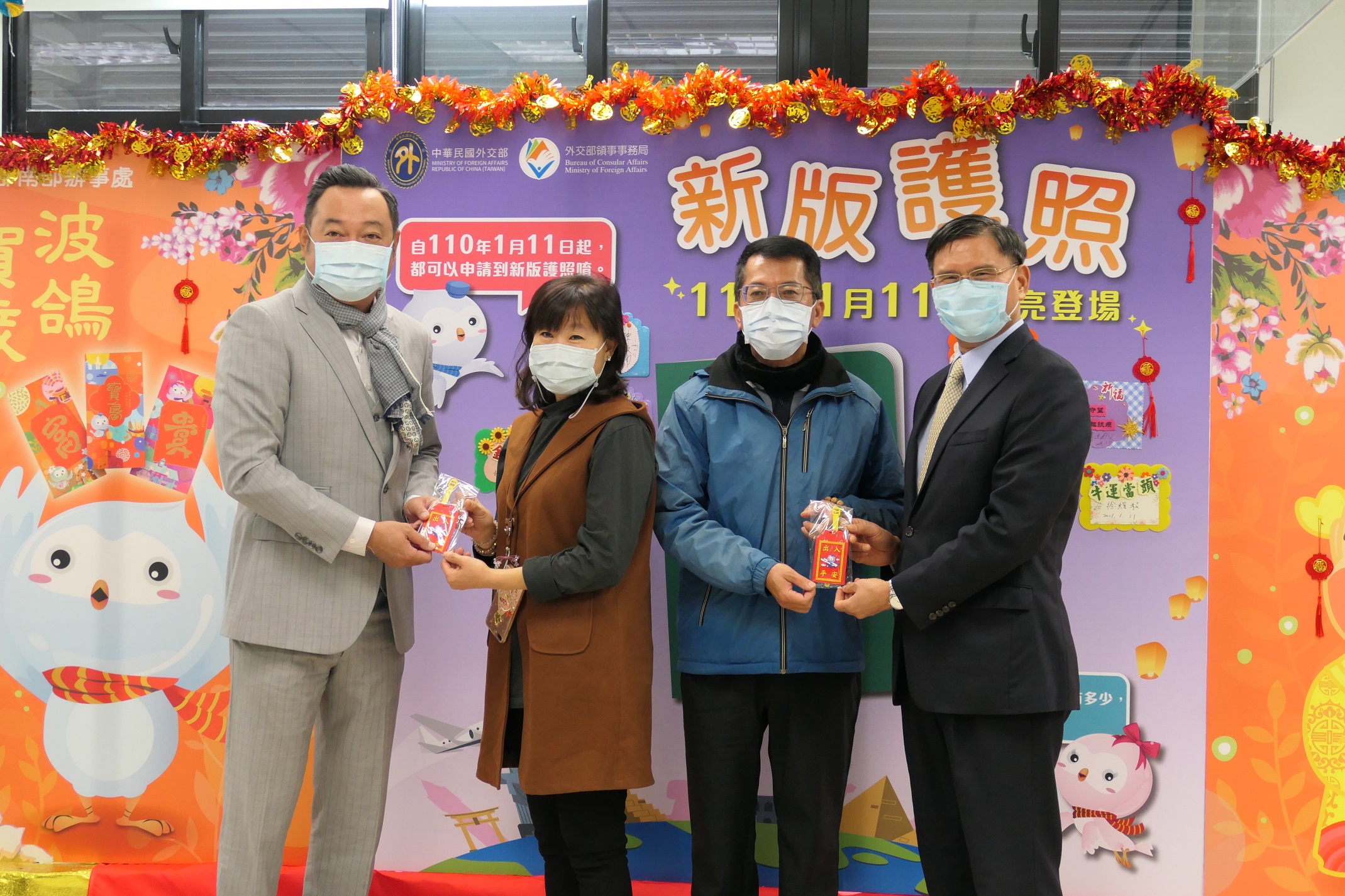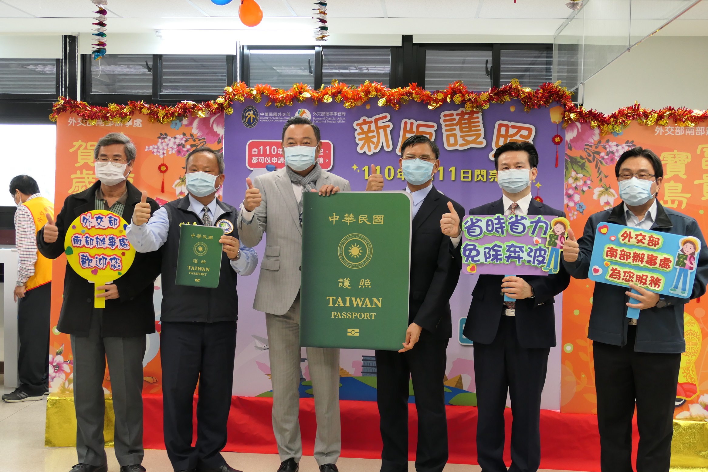 為提升我國護照的辨識度,維護我國人旅外權益及便利,外交部自110年1月11日起發行新版晶片護照,外交部南部辦事處於同日上午10時舉辦宣導活動,並邀請行政院南部聯合服務中心執行長陳政聞、內政部移民署高一站主任徐志權、高雄市政府民政局專門委員林清益及苓雅戶政事務所主任徐煜程等貴賓一起共襄盛舉。發行首日一早已有民眾在現場等候,甚至有民眾一次代辦多位家人護照,申請相當踴躍。