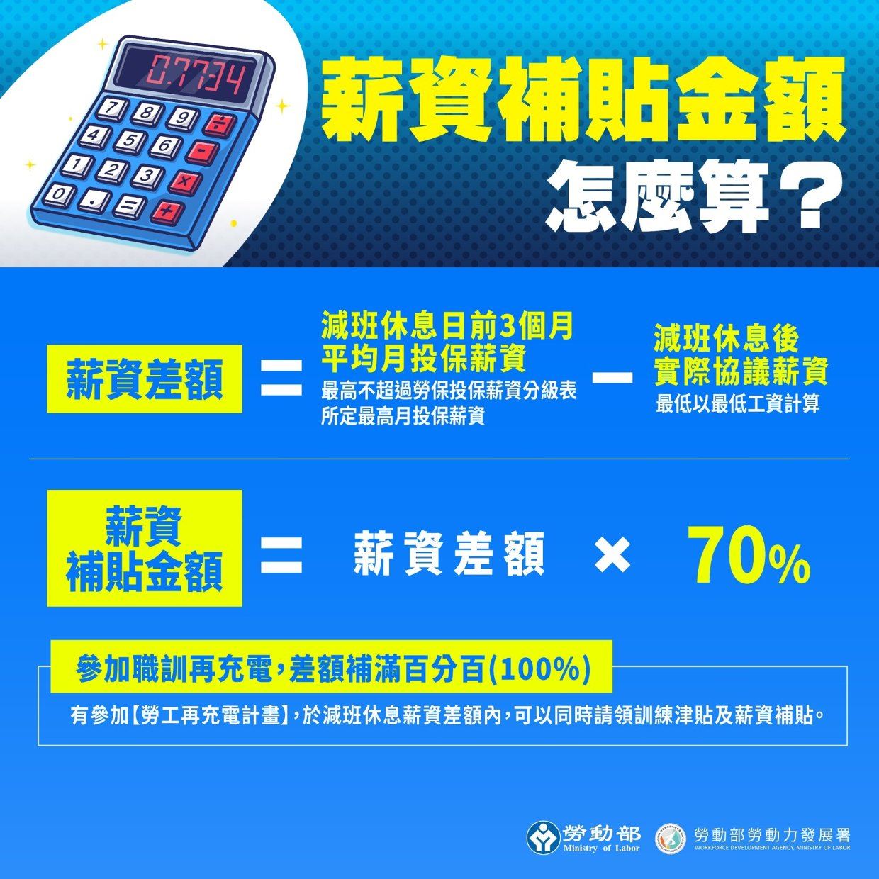符合9行業在職勞工如經勞雇雙方協商同意減班休息達30日以上,經地方勞工行政主管機關列冊通報,可自減班休息日起算,每滿30日之次日起90日內提出申請。而薪資差額70%的補貼計算方式是以勞工實施減班休息日前1個月至前3個月的平均月投保薪資與實施減班休息後實際協議薪資差額的70%發給(無條件進位至百位數),每人每月最高12,100元。舉例來說,一名平均月投保薪資為45,800元的全時勞工,減班休息後實際協議薪資為30,000元,即可申請補貼11,100元[=(45,800元-30,000元)×70%]。此外,由於勞工在申請時,對於「減班休息實施期間達30日以上」規定的認定,較容易有疑問,因此勞動部特別指出,是以「勞雇雙方協商減少工時協議書」上載明的減班休息實施期間達30日以上為準,並非指要連續30日都實施減班休息。舉例來說,減班休息實施期間為114年8月1日至114年8月30日,每週2日減班,即符合薪資差額補貼資格。