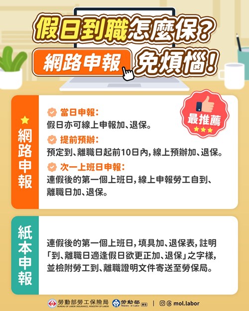 勞動部補充,投保單位如尚未申請為勞保局網路申辦單位,應於假日後第1個上班日,填具加、退保申報表,於表內註明「到、離職日適逢假日欲更正加、退保」之字樣,並檢附勞工到、離職證明文件郵寄或親送勞保局,保險效力一樣可自到、離職日當日開始或停止。